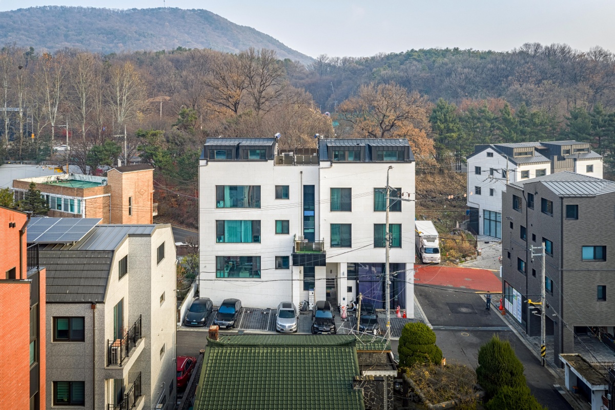 또한 병원이나 백화점, 문화 공간 등 도심 생활의 인프라를 누리면서도 녹지에 접해있고 여기에 건축비 부담을 상쇄 시키려면 임대 수익도 고려해야 하고 노부모의 활동력이나 임대의 용이성 까지 갖추려면 대중교통 인프라도 연결돼야 했기 때문에 단독주택이 가장 적합하다고 생각했습니다.
